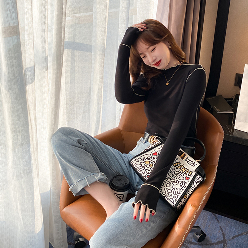 Y8814-(4色入内)时尚气质木耳边长袖半高领弹力修身设计感纯色T恤 打底衫