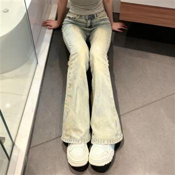 YF6673-图片港式微喇叭系扣高腰洗水扎染提臀显瘦修身休闲百搭牛仔裤