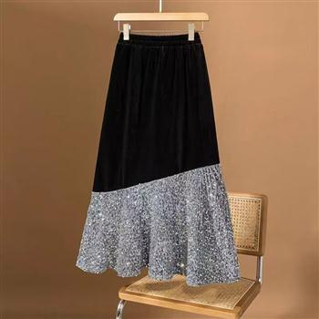 YF6676-(3色入内)甜美新款松紧腰收腹丝绒拼接亮片别致时尚冬季精品半身裙