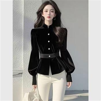 YF6677-图片色金丝绸秋冬新款泡泡袖立领排扣修腰显瘦开叉设计黑色上衣