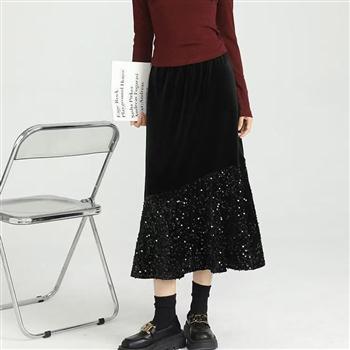 YF7113-图片色时尚亮片设计松紧腰丝绒褶折鱼尾大摆轻奢气质半身裙
