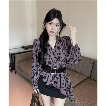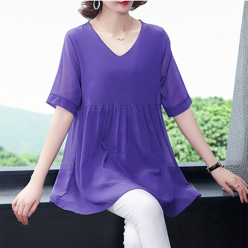 Y0345-(4色入内)韩版短袖套头V领褶析收腹显瘦A字加大码清凉雪纺衫