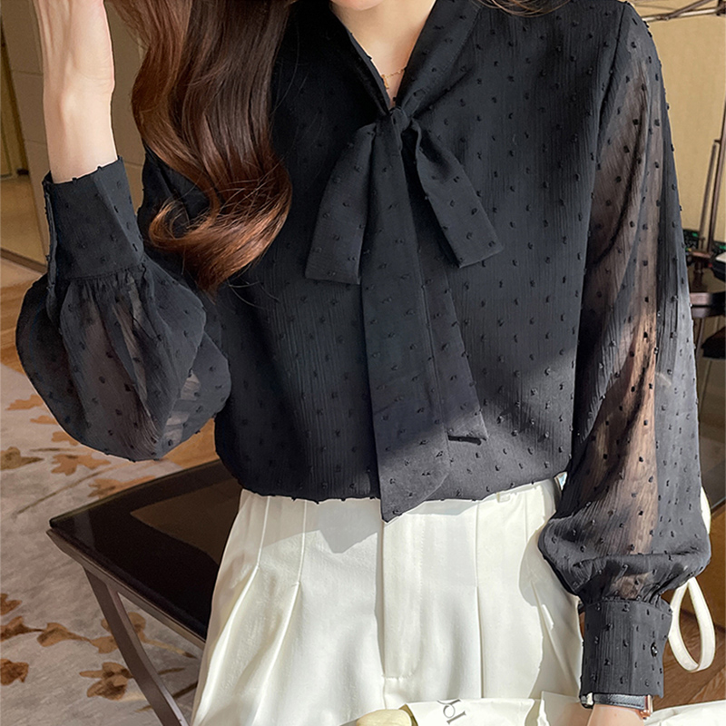 Y1081-(2色入内)优雅时尚泡泡袖系蝴蝶结秀气显瘦植绒大码通勤高贵雪纺衫
