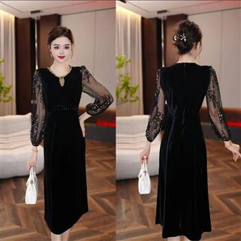 YF5804-(3色入内)甜美一字肩飘带短袖收腰褶折赫本风花苞设计蓬蓬礼服