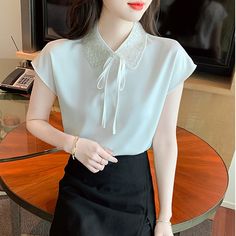 YF0333-图片色时尚新款钉珠娃娃领系蝴蝶结宽松显瘦轻奢短袖桑丝雪纺衫
