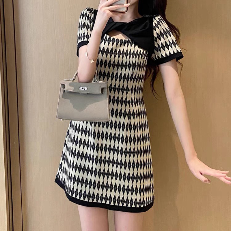 YF0397-图片色时尚设计感新品菱形镂空套头蝴蝶结修腰礼服裙 复古气质连衣裙