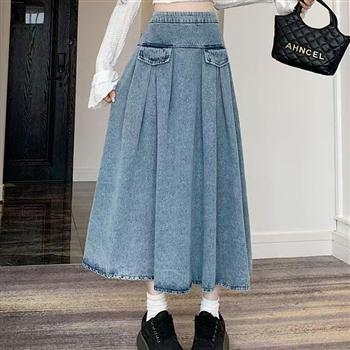 YF6471-(2色入内)学院风港式高腰A字褶折中长款大摆洗水牛仔半身裙