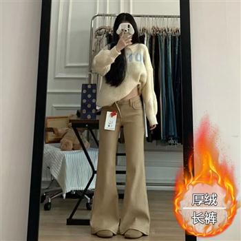 YF6476-图片紫冬季加绒保暖微喇叭系扣高腰港式休闲卡其色辣妹潮流牛仔裤