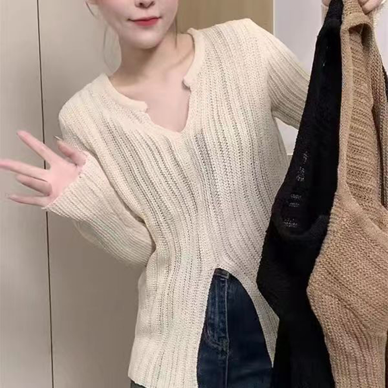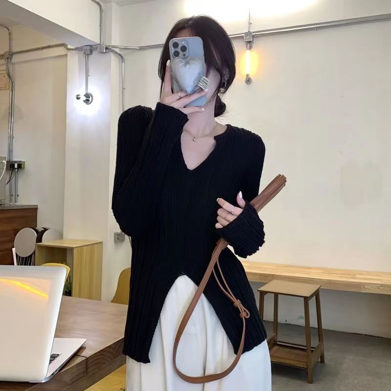 YF1340-(4色入内)时尚开叉设计感长袖V领修腰开叉绉纹早春气质针织上衣