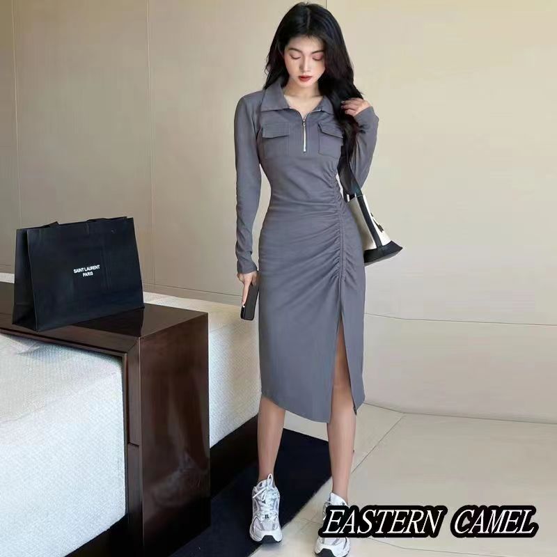 YF1509-(2色入内)韩版长袖翻领拉链口袋设计感实褶折开叉别致显瘦T恤连衣裙