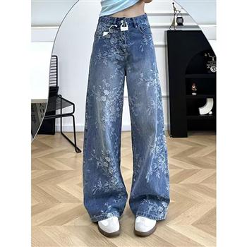 YF7188-图片色韩版个性设计碎花系扣高腰直筒坠地感提花复古牛仔裤