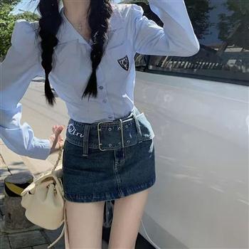 YF7192-(2色入内)韩版甜美时尚长袖翻领褶折收腰徽章刺绣收腰别致白色简洁上衣
