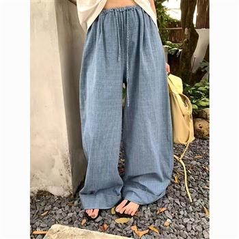 YF7193-图片色港式薄款抽绳松紧腰直筒坠地感复古格子纹慵懒风大码休闲裤