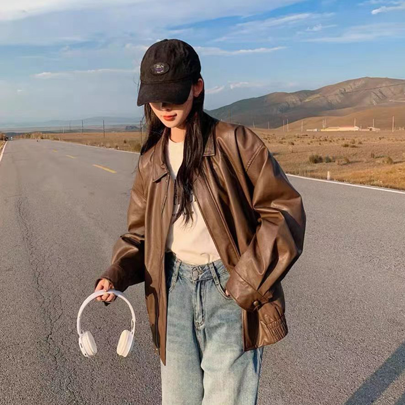 YF1758-(2色入内)秋冬拉链POLO领宽松大码短款PU皮复古机车夹克 新款外套