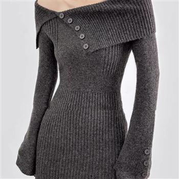 YF6063-(3色入内)时尚冬季翻领排扣露肩弹力收腰包臀设计感针织连衣裙