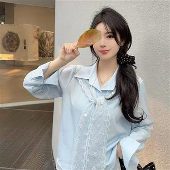 YF6065-(3色入内)春秋时尚蕾丝围巾系腰百搭长袖翻领宽松大码两件套雪纺衫