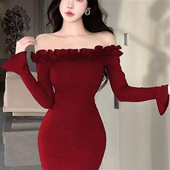 YF6066-(3色入内)性感时尚荷叶边一字肩长袖弹力修身包臀纯欲风短裙