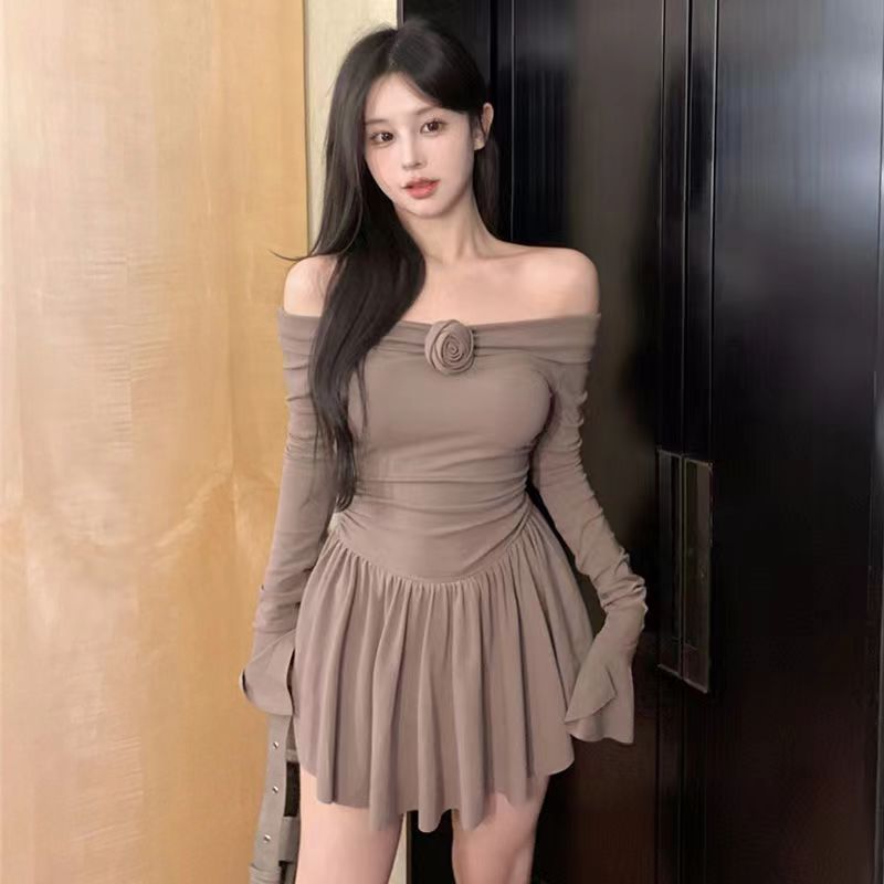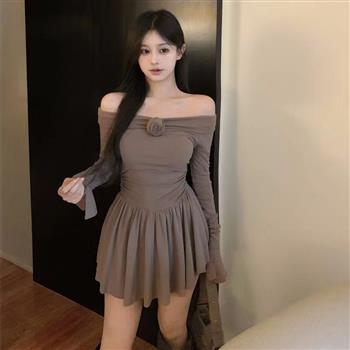 YF2273-图片色性感时尚一字肩小心机花朵弹力抹胸百褶拼接辣妹连衣裙