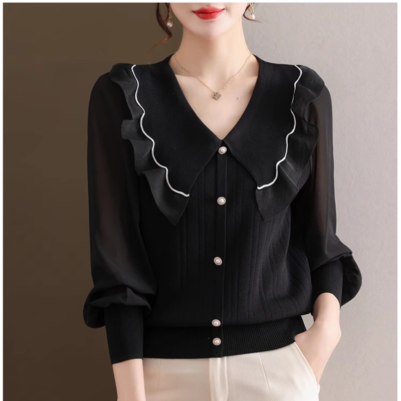 YF2433-(2色入内)甜美名媛气质雪纺袖拼接冰丝娃娃领系扣弹力薄款上衣