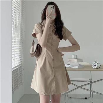 YF2469-(4色入内)简装新款POLO领短袖排扣修腰显瘦学院风衬衫裙