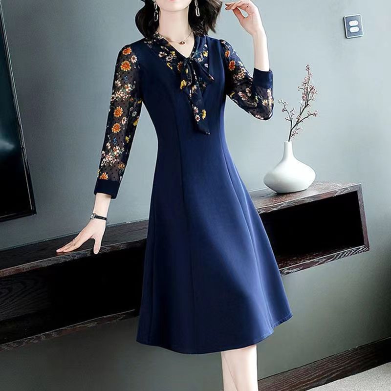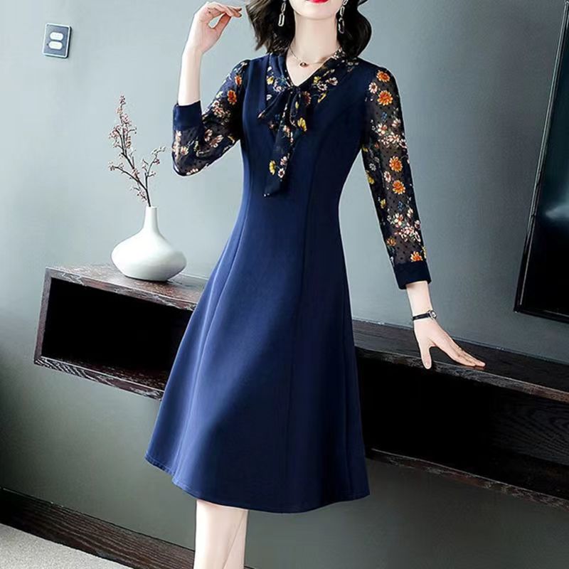 YF2568-(2色入内)优雅网纱拼接系蝴蝶结碎花修腰假两件大方得体连衣裙