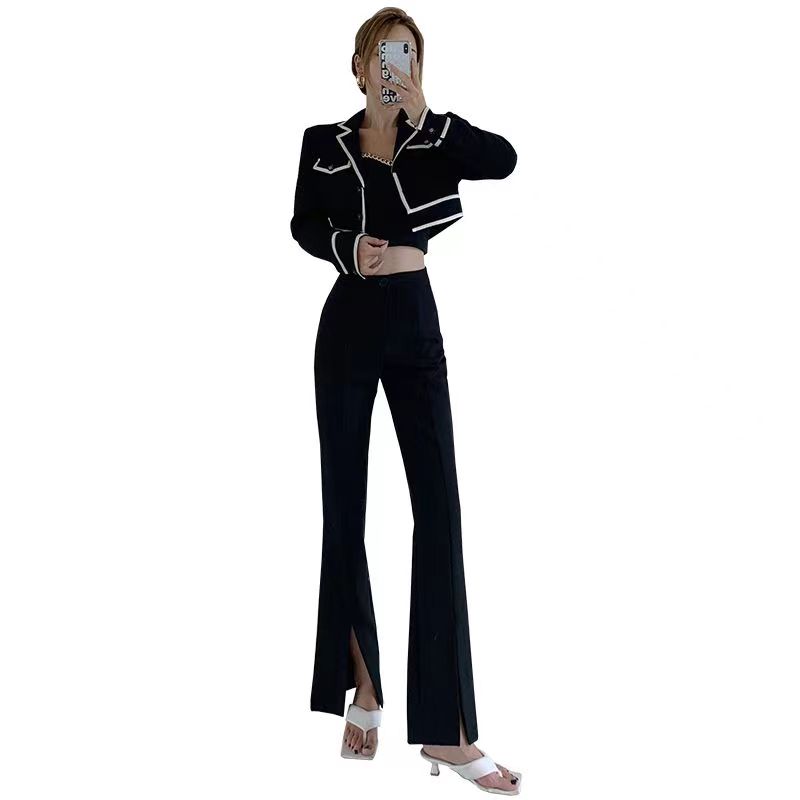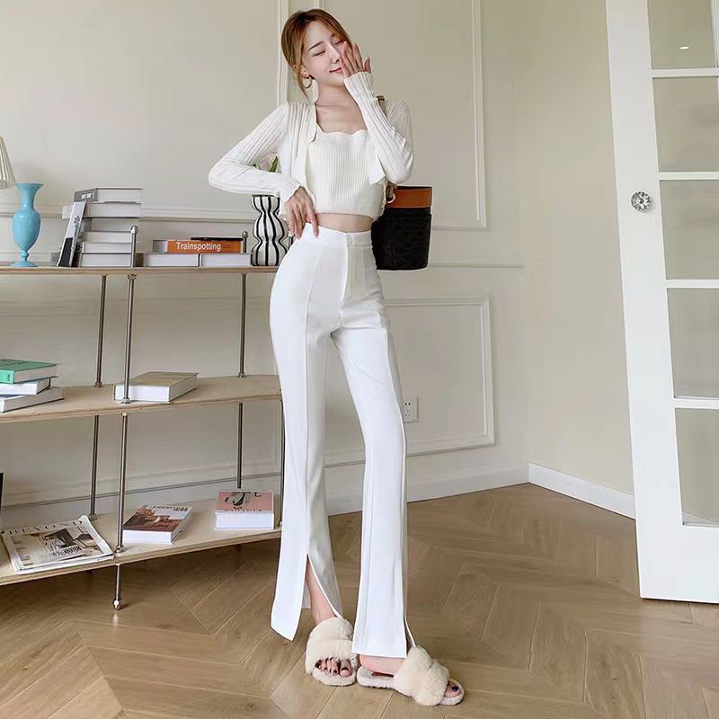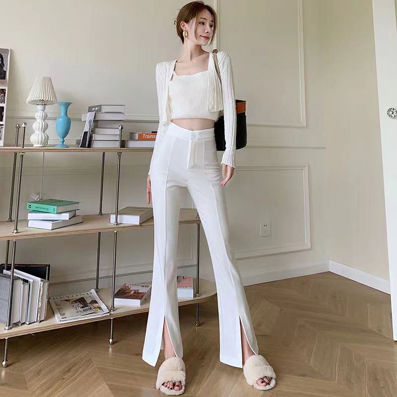 YF2575-(2色入内)春夏薄款马蹄裤 新款高腰系扣开叉微喇叭坠地感西装裤