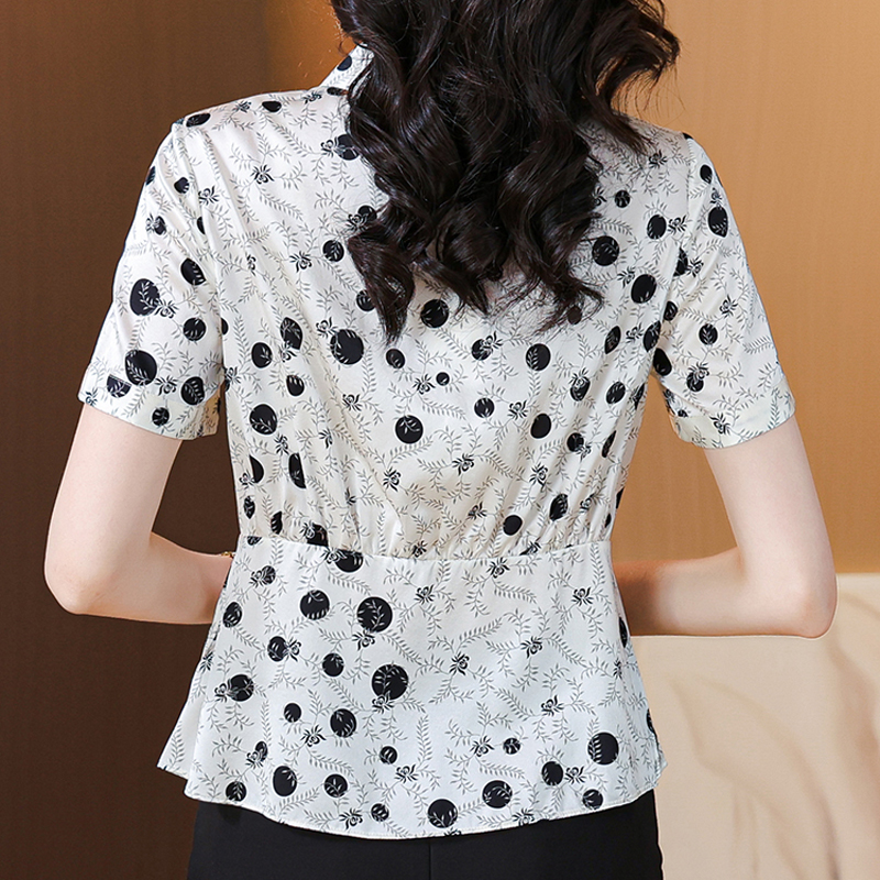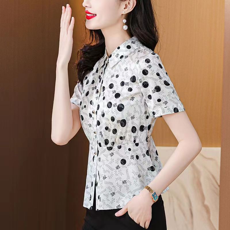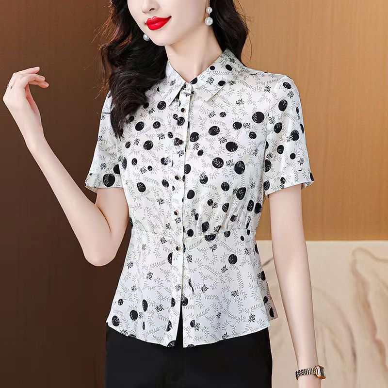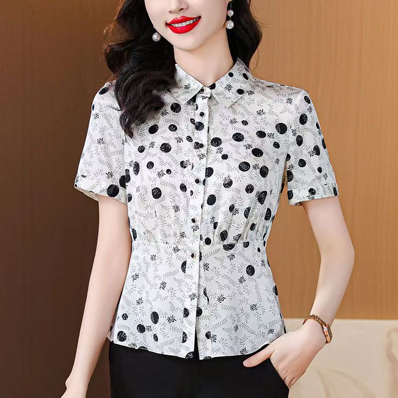 YF2591-图片色新款夏季不规则波点碎花褶折修腰短袖翻领丝滑蚕丝衬衫