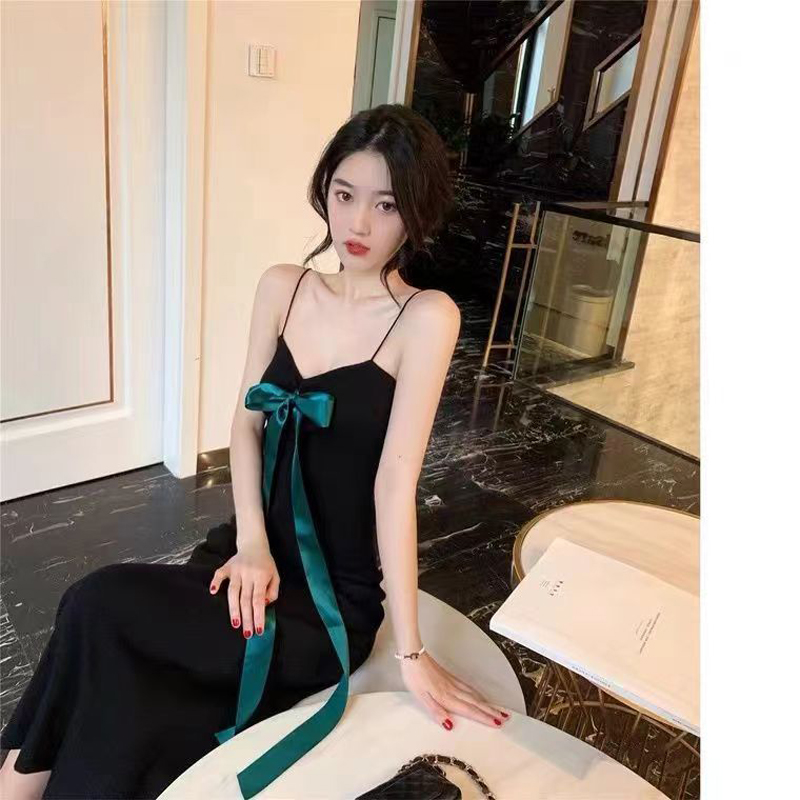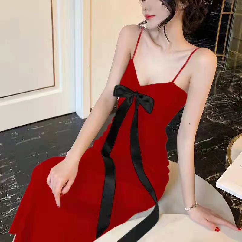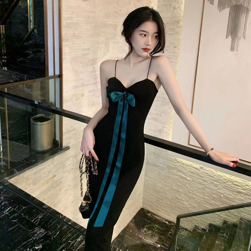 YF2602-(2色入内)性感辣妹装吊带蝴蝶结修腰包臀过膝长款礼服 名媛气质连衣裙