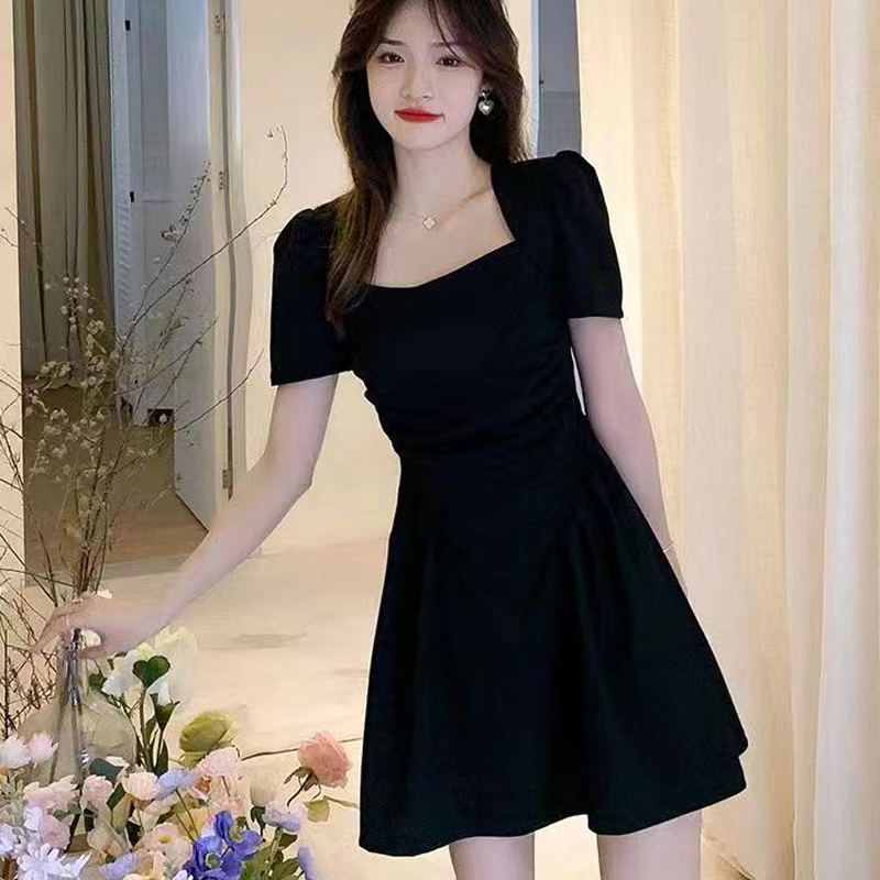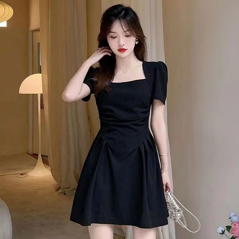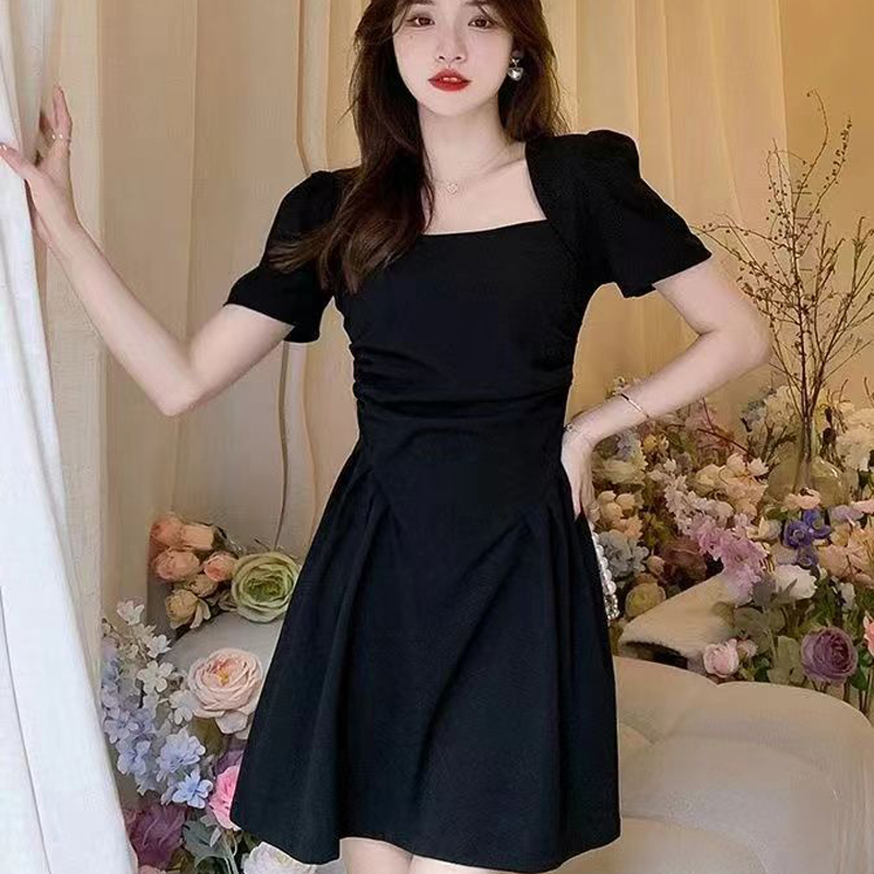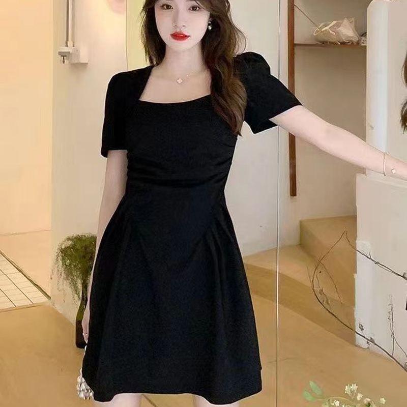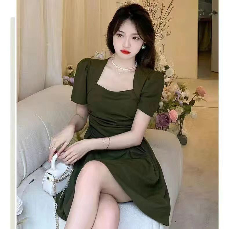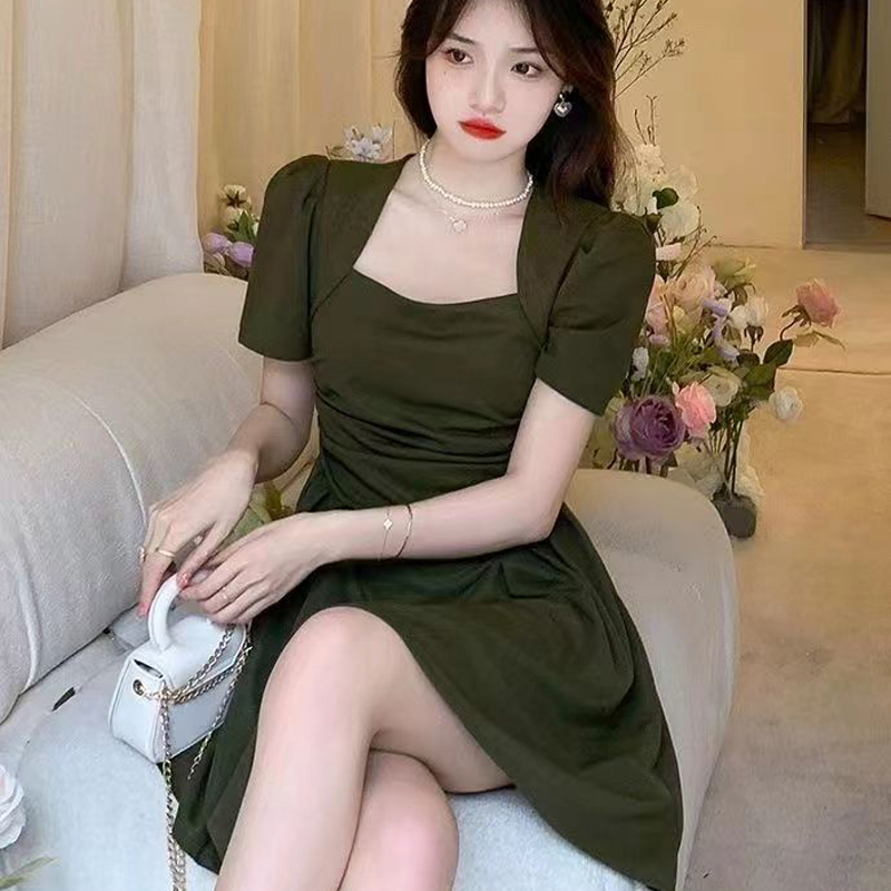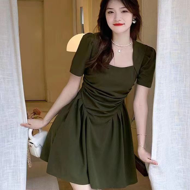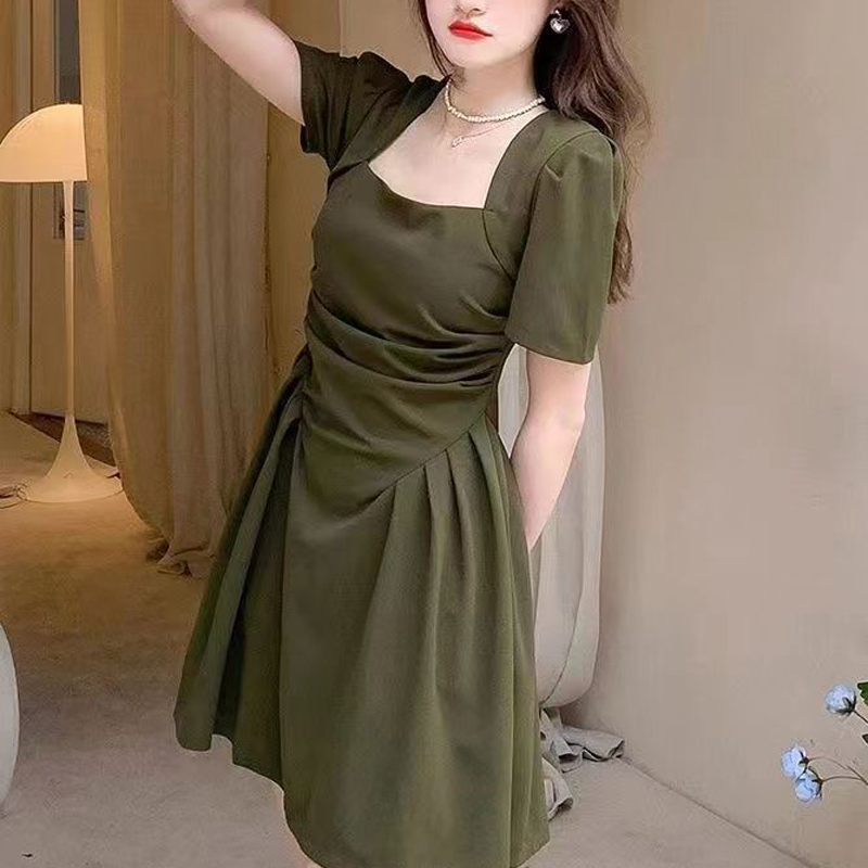 YF2725-(2色入内)夏季短袖方领褶折收腰高雅气质纯色OL通勤连衣裙