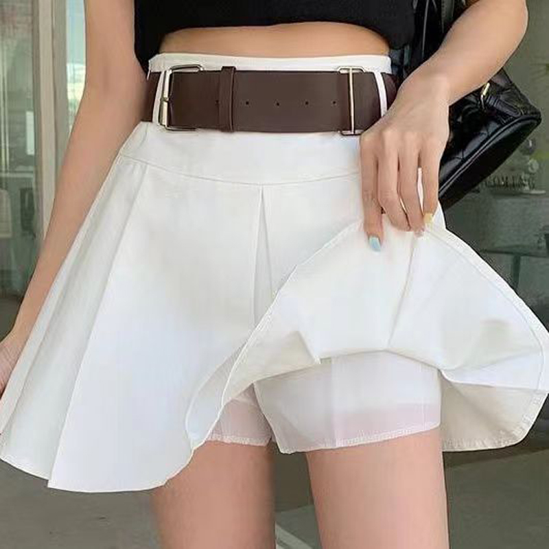 YF2800-(4色入内)优雅时尚系腰带A字褶折夏装显瘦西装裙 新款防走光半身裙