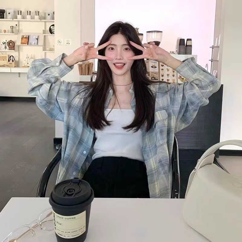 YF2828-图片色原宿风长袖翻领复古格子中长款薄款休闲百搭衬衫
