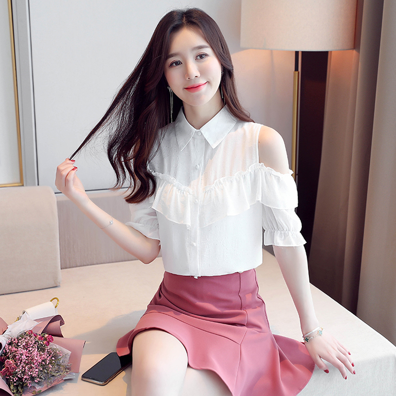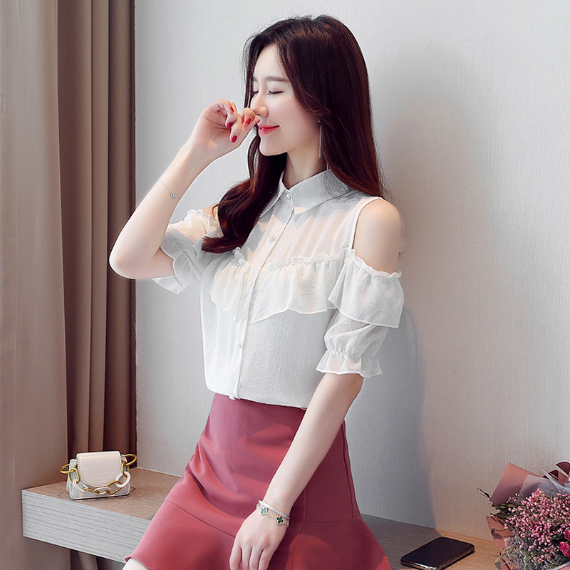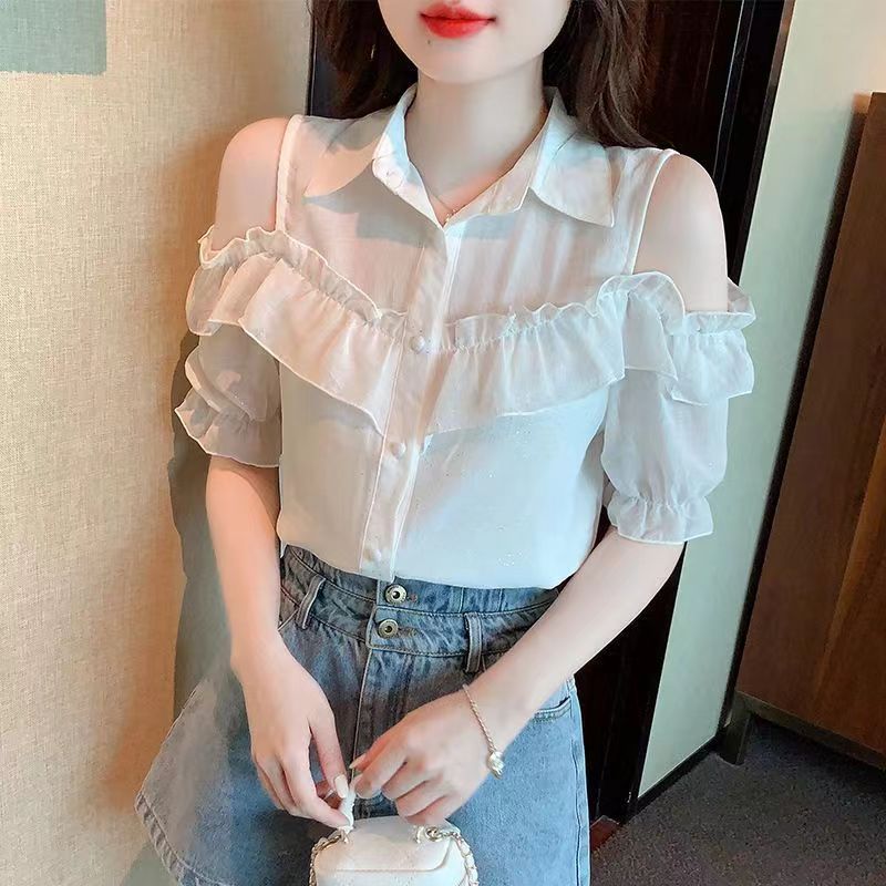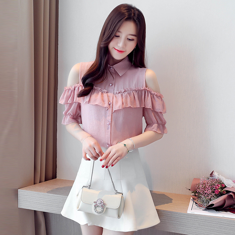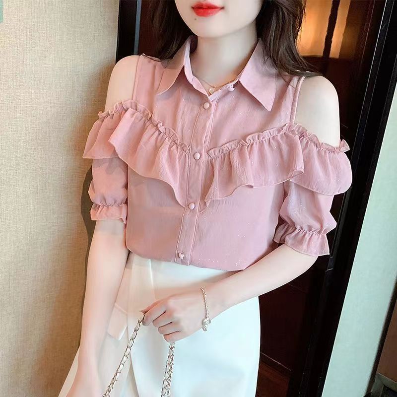 YF2847-(3色入内)新款夏装镂空短袖翻领荷叶边系扣宽松大码雪纺衫