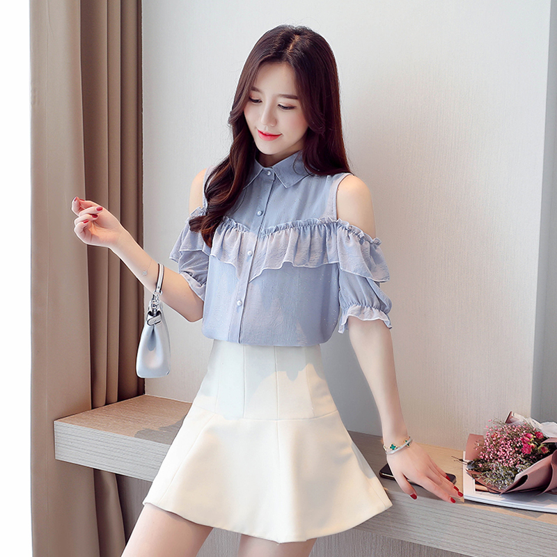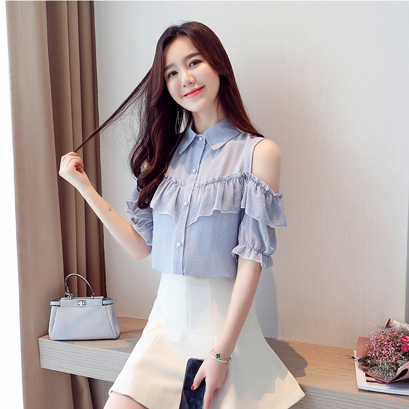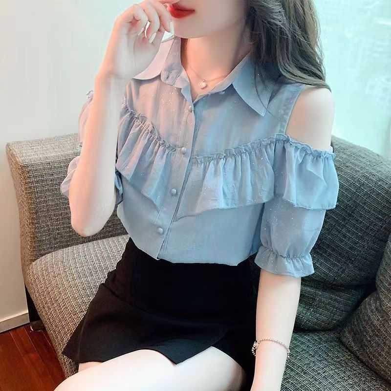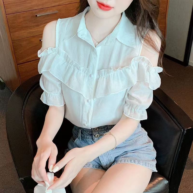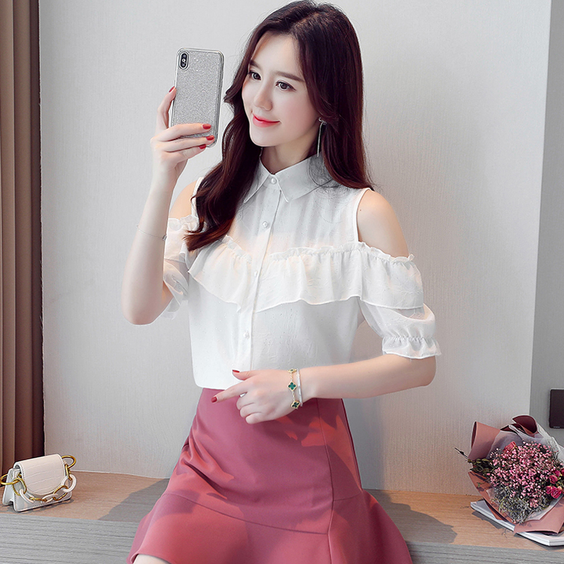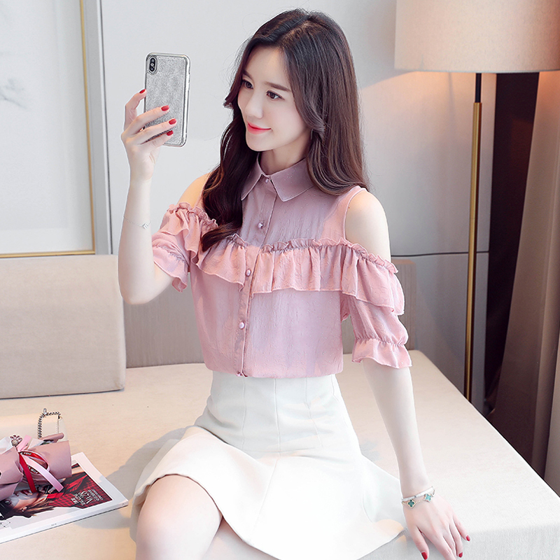 YF2847-(3色入内)新款夏装镂空短袖翻领荷叶边系扣宽松大码雪纺衫
