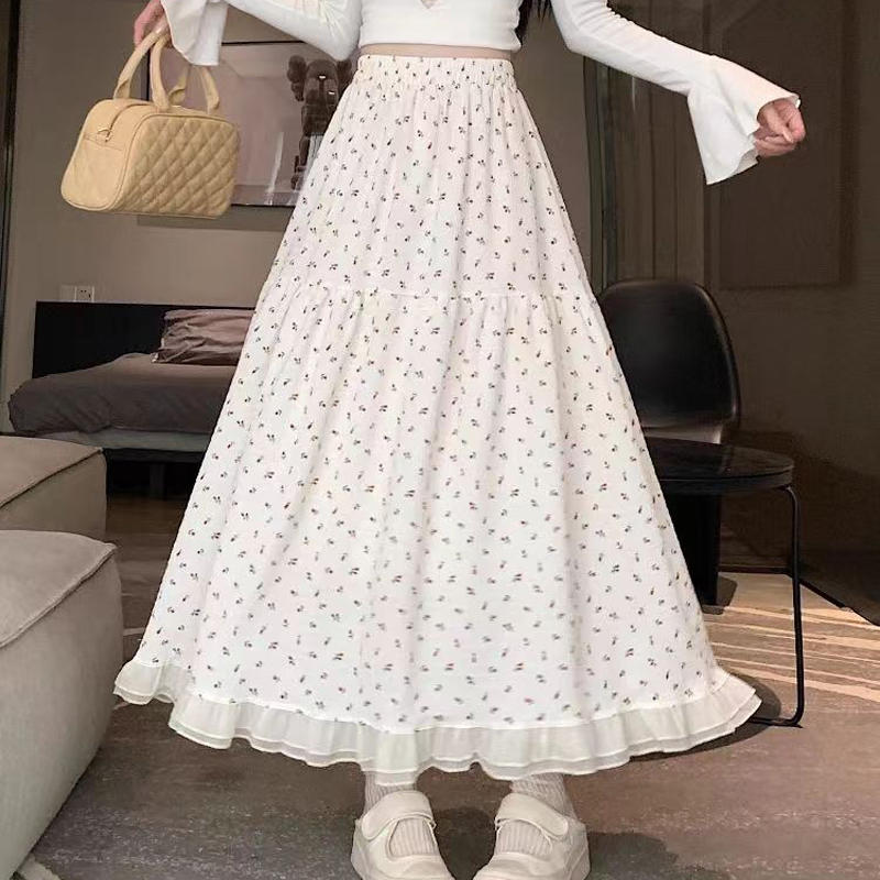 YF2861-(2色入内)时尚薄款碎花松紧腰拼接蕾丝边大摆A字半身裙