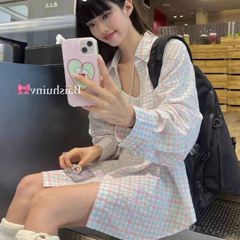 YF2952-图片色ins复古格子长袖翻领宽松大码学院风休闲百搭新款衬衫