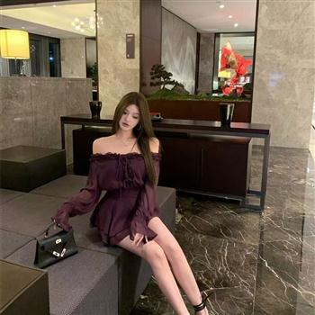 YF6956-图片色性感辣妹一字领荷叶边抽绳束腰显瘦洋气紫色头短装雪纺裙