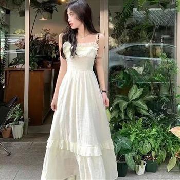 YF2969-图片色优雅时尚吊带木耳边褶折大摆法式气质夏季长裙