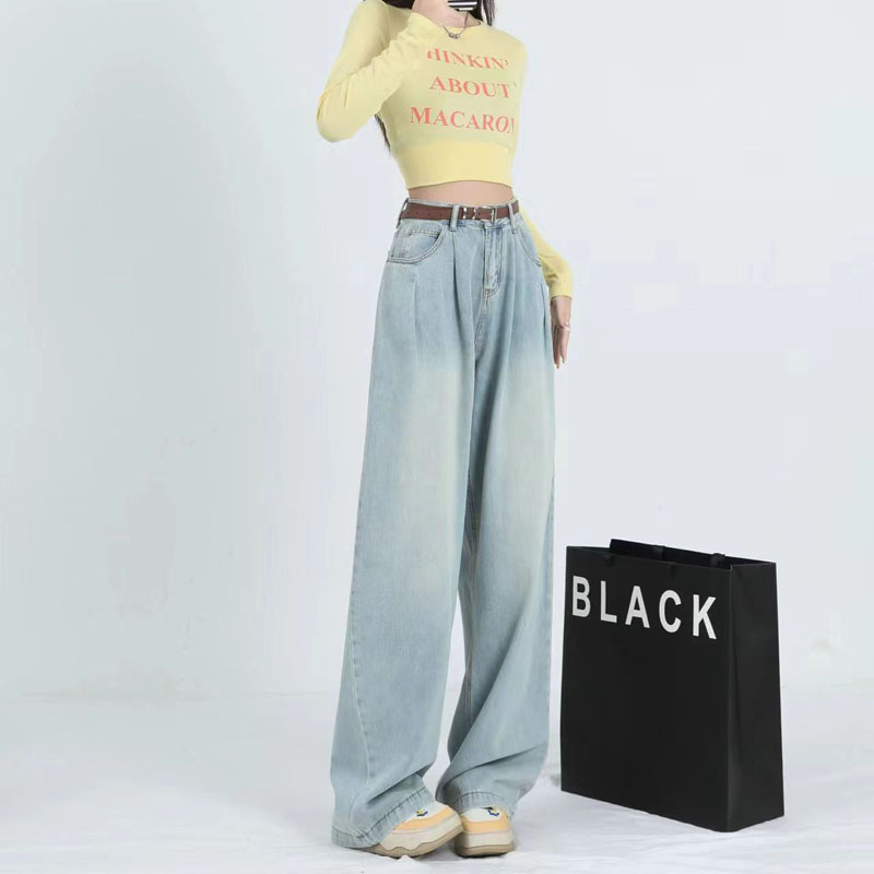 YF3284-图片色时尚阔腿慵懒风牛仔裤 韩版高腰系扣ins风拖地休闲裤