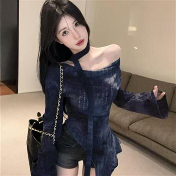 YF6692-(2色入内)性感辣妹潮流一字肩飘带设计不规则收腰时尚打底上衣