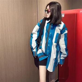 YF6971-图片色港式春季新款长袖翻领蓝白条纹胖MM显瘦慵懒风个性衬衣