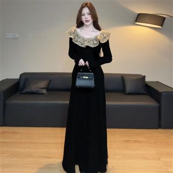 YF6974-图片色优雅时尚后背绑绳收腰显瘦蕾丝荷叶边赫本风黑色长裙