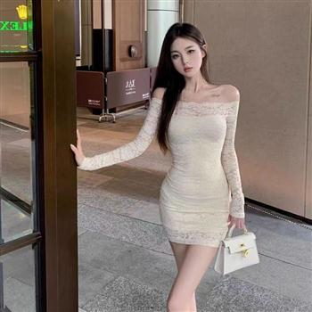 YF3688-(3色入内)性感时尚一字肩镂空长袖露肩弹力修腰包臀御姐蕾丝连衣裙