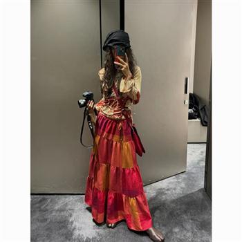 YF7031-图片色优雅时尚渐变红色A字拼接格纹感松紧腰复古宽松显瘦长裙