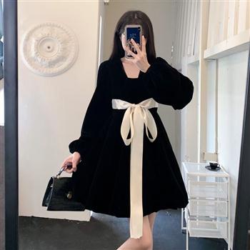 YF7034-图片色赫本风春秋时尚灯茏袖套头撞色蝴蝶结收腰显瘦丝绒高级感连衣裙