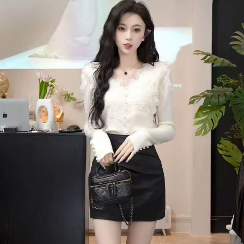 YF3947-(2色入内)甜美蕾丝拼接排扣长袖套头V领秋冬新款针织衫 气质上衣