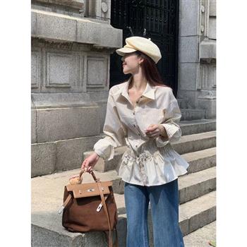 YF6300-(3色入内)秋冬高级感长袖翻领系扣松紧腰设计chic条纹显瘦法式上衣