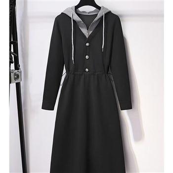 YF6303-图片色韩系长袖连帽排扣抽绳收腰过膝中长款假两件拼接卫衣裙