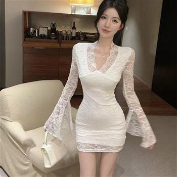 YF6302-(3色入内)微喇叭长袖花边领修腰紧身包臀提花蕾丝名媛气质连衣裙