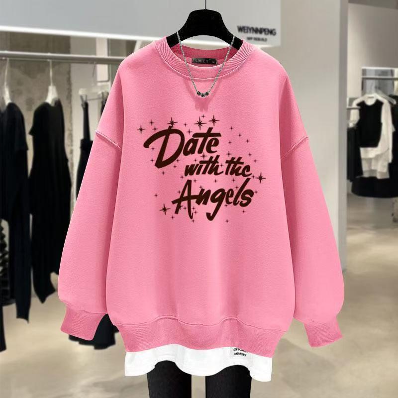 YF4004-(6色入内)学院风假两件拼接胖MM显瘦大码休闲百搭字母印花卫衣