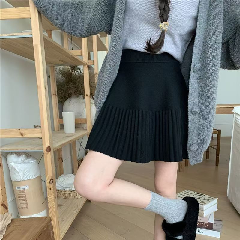 YF4159-(3色入内)秋冬针织收腰A字弹力百褶裙 时尚百搭纯色针织半身裙